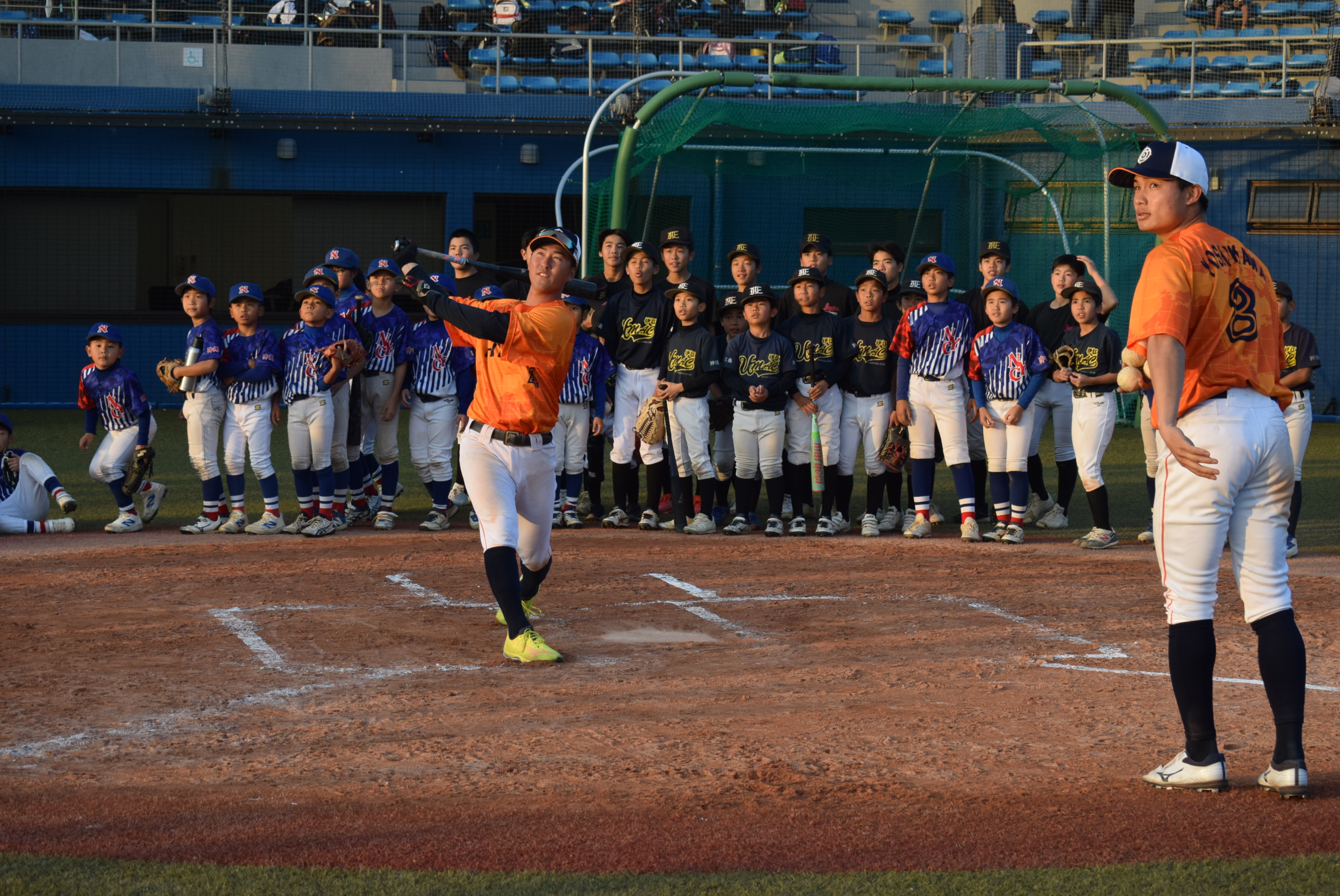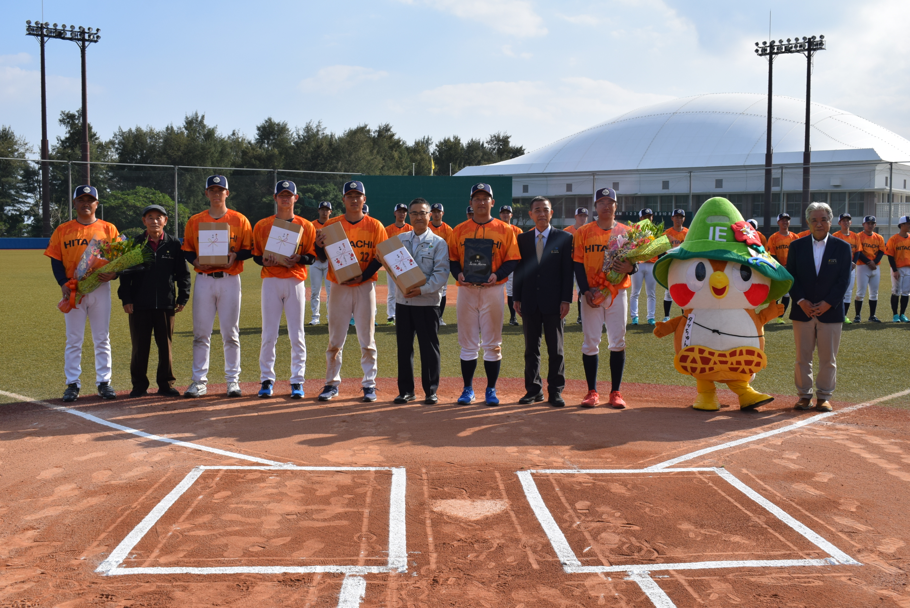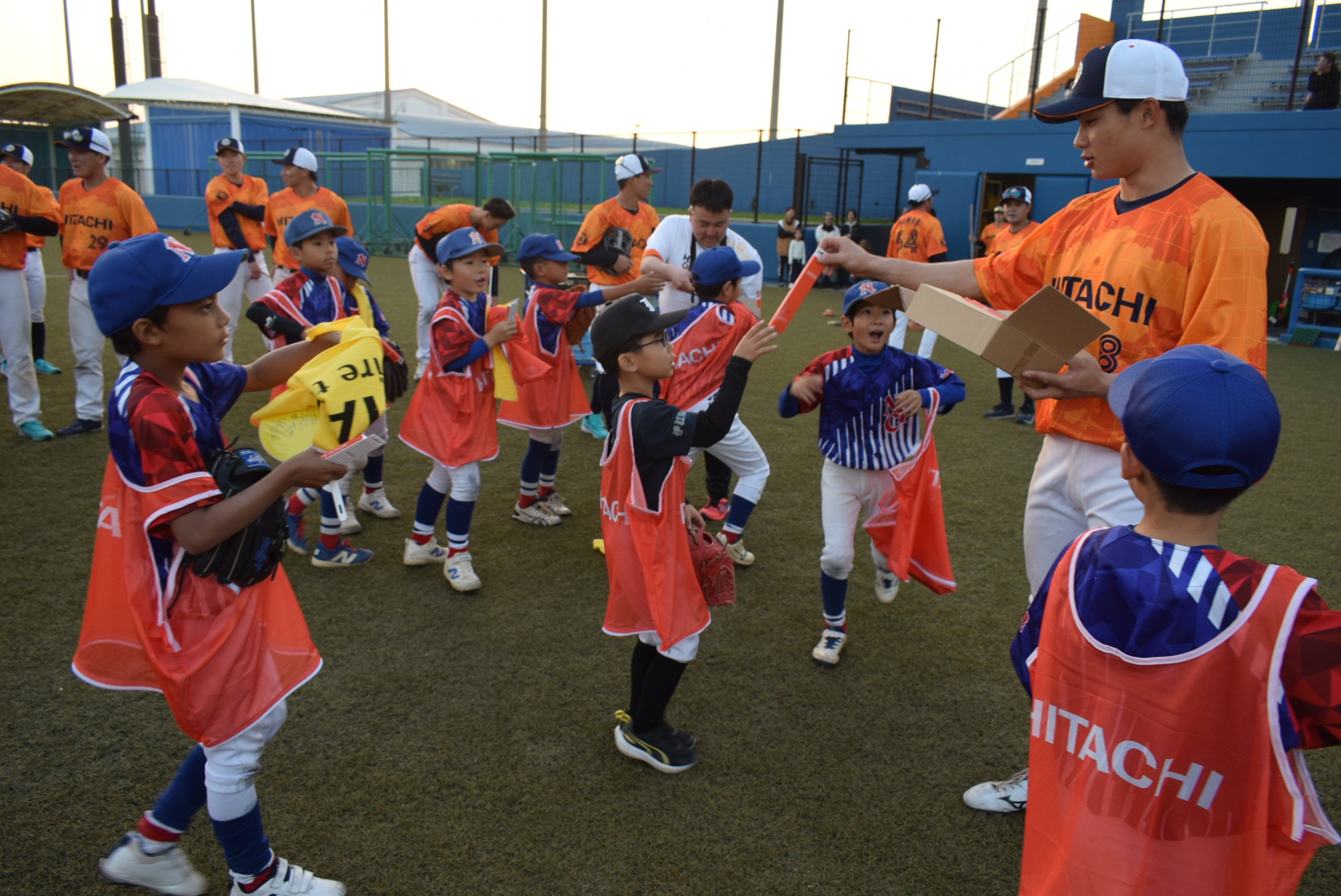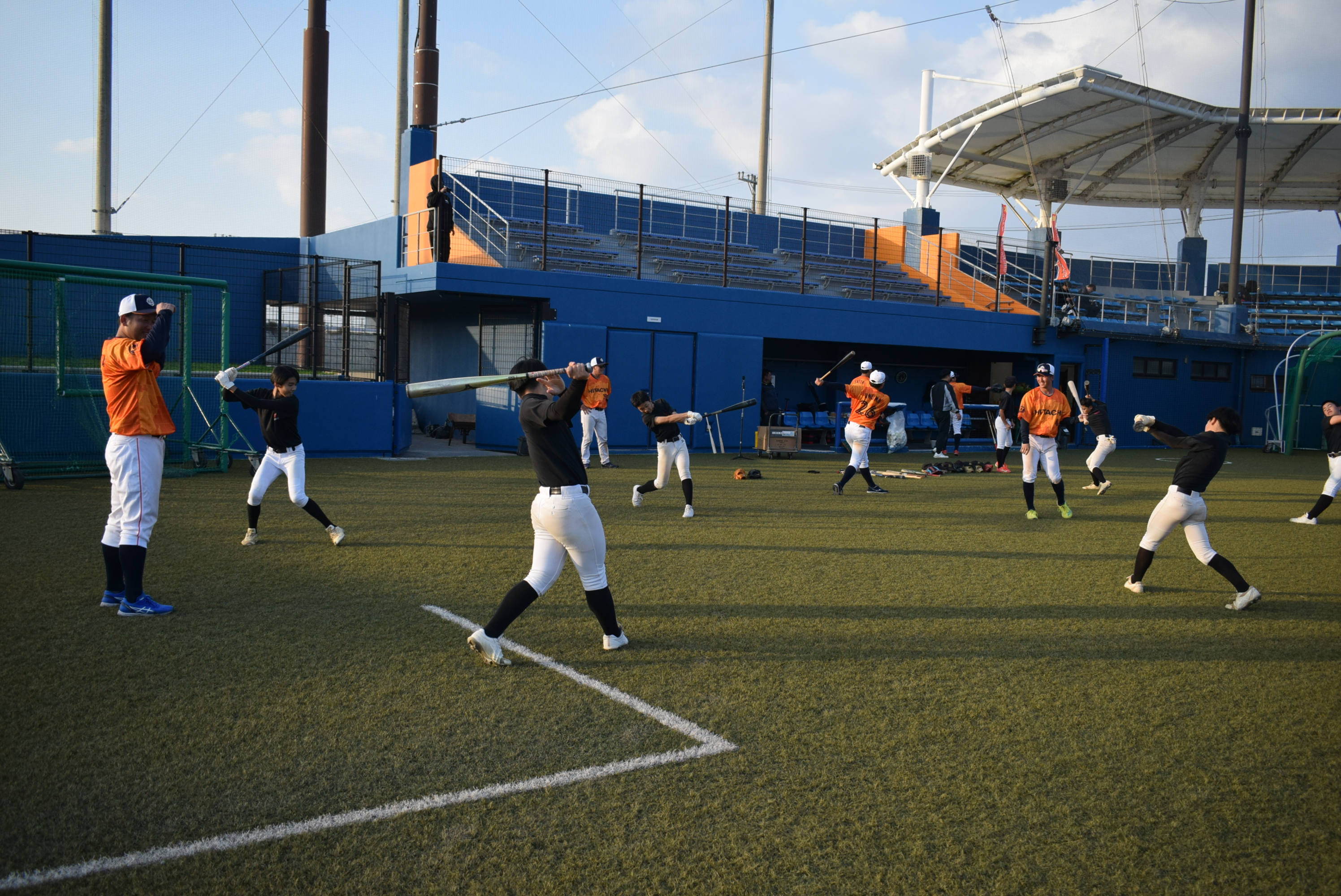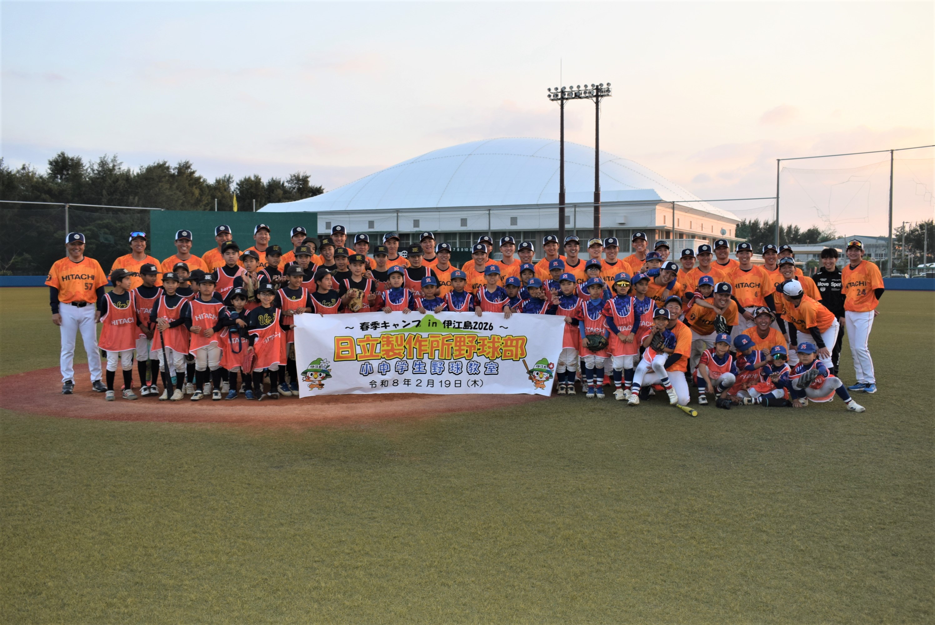 伊江村野球場で2月19日、日立製作所野球部による小中学生野球教室が開催され、伊江中学校野球部と少年野球チームのNYCとUMACの選手たちおよそ40人が集まりました。